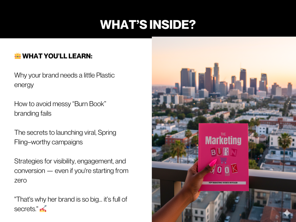 Channel your inner Regina George and dominate your niche with the Marketing Burn Book — a cheeky, no-fluff digital guide for entrepreneurs, small biz baddies, and online hustlers ready to ditch the guesswork and glow up their marketing strategy.